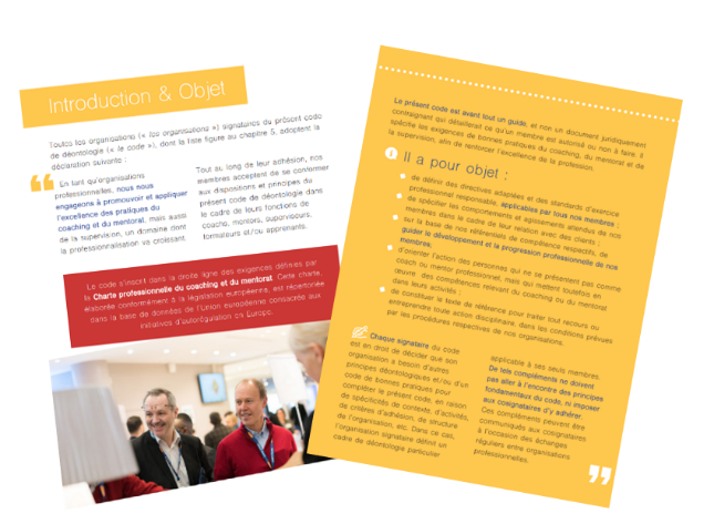 En tant qu’organisations professionnelles, nous nous engageons à promouvoir et appliquer l’excellence des pratiques du coaching et du mentorat, mais aussi de la supervision, un domaine dont la professionnalisation va croissant. Tout au long de leur adhésion, nos membres acceptent de se conformer aux dispositions et principes du présent code de déontologie dans le cadre de leurs fonctions de coachs, mentors, superviseurs, formateurs et/ou apprenants.